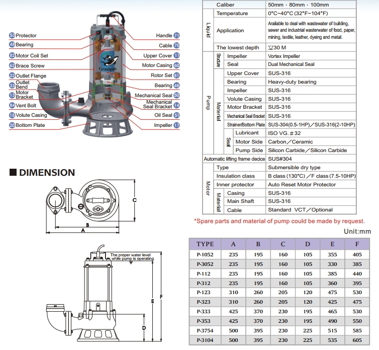 - Cấu tạo của máy bơm chìm nước thải Grampus P-3754 7.5HP đặc biệt vì vừa có thể hút nước thải và hút rác thải sinh hoạt.